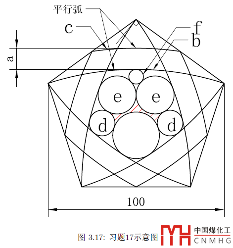 這張圖只給出了一個尺寸:100,感覺無從下手。但這種圖必須要弄清楚隱含的條件,外圍是正五邊形不必說了,那條圓弧與五邊形的邊垂直,隱含就是兩端都垂直,那圓心就在這兩條邊上,延長就可以得到圓心。另外一條圓弧可以偏移得到,不過位置是通過五邊形的中點(diǎn)的。另外這個圖形是中心對稱的,最下面的圓除和兩條圓弧相切外,圓心應(yīng)該在中間的對稱軸上,確定了這一個圓,其他圓就簡單了。