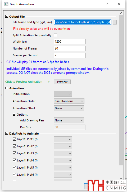 繪制好圖形,打開Graph Anim插件,設(shè)置相應(yīng)的Output File、Animation、Dataplots to Animate等選項(xiàng),點(diǎn)擊Preview預(yù)覽結(jié)果,點(diǎn)擊OK自動導(dǎo)出為動圖或者視頻。