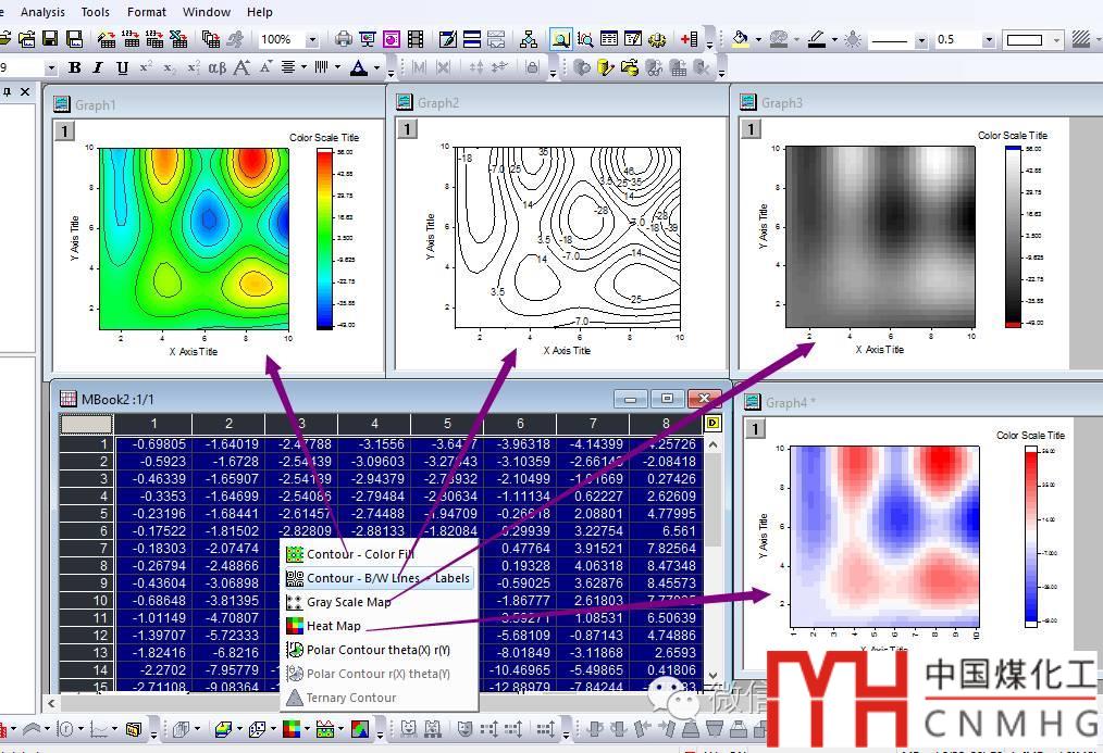 Contour圖的幾種類型:Color fill,B/W lines+Label,Grey Scale Map和Heatmap幾種形式(極坐標(biāo)Contour圖和三元Contour圖除外,后續(xù)會介紹),通過一定的格式設(shè)置,幾種圖形可以相互轉(zhuǎn)化。