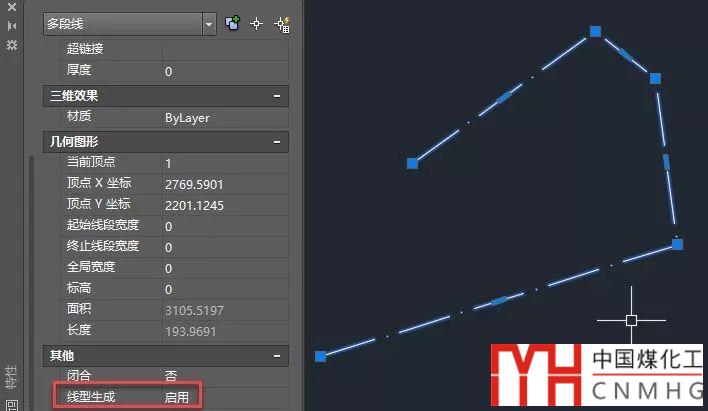要想讓虛線(xiàn)將多段線(xiàn)作為整體進(jìn)行排列,需要在特性面板或用編輯多段線(xiàn)PE命令打開(kāi)線(xiàn)型生成參數(shù),如下圖所示。