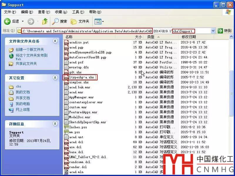 保存繪制好ZIGZAG線的圖紙,退出CAD。找到CAD安裝目錄下的FONTS目錄,將ltypeshp.shx文件改名。CAD為了防止線型、公差、默認(rèn)替換字體用的形文件被以外刪除,在%appdata%中CAD的SUPPORT目錄下單獨(dú)保留了ltypeshp.shx,所以還需要到那個(gè)目錄下進(jìn)行改名,如下圖所示。