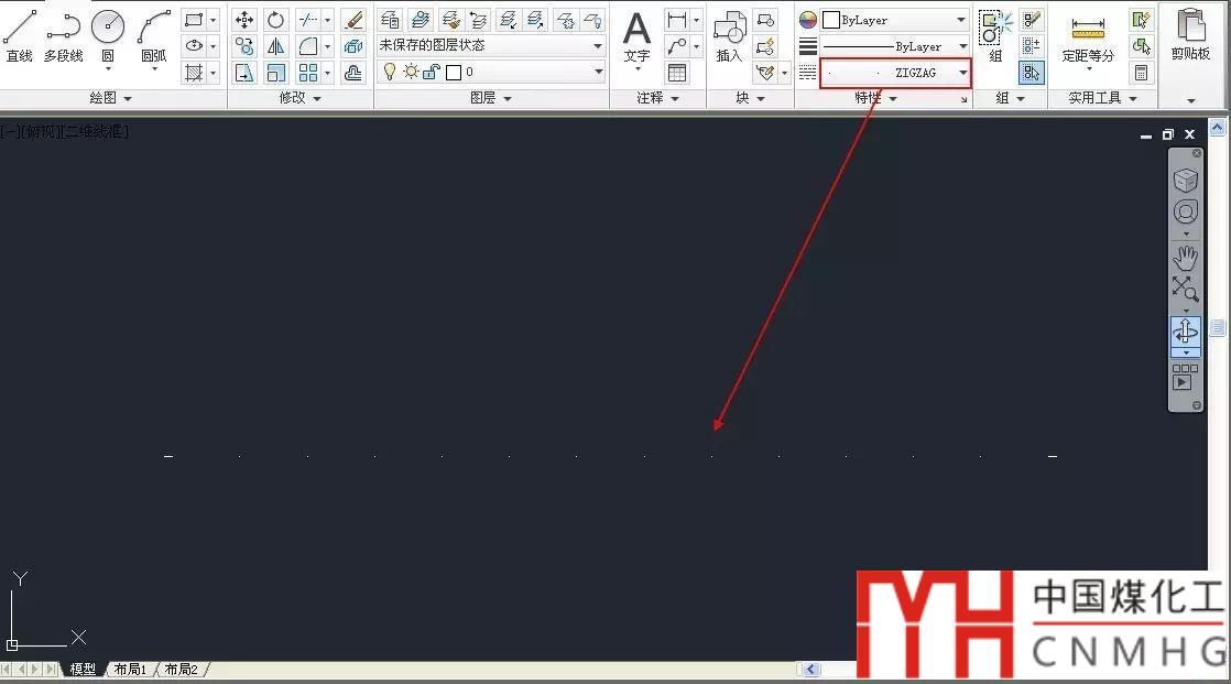畫(huà)一條直線,加載ZIGZAG線型,將直線的線型設(shè)置為ZIGZAG,調(diào)整成合適的線型比例,如下圖所示。