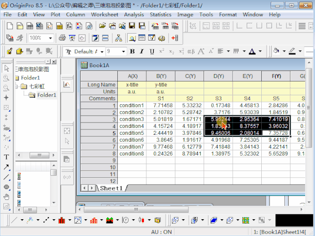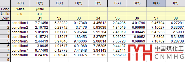 大家根據(jù)自己的數(shù)據(jù)結(jié)構(gòu),準(zhǔn)備不多于8條件×8樣品的數(shù)據(jù)表(上表),在表中將Long Name、Units以及Comments的內(nèi)容修改為自己的標(biāo)簽,調(diào)用模板時(shí)即可成功出圖。