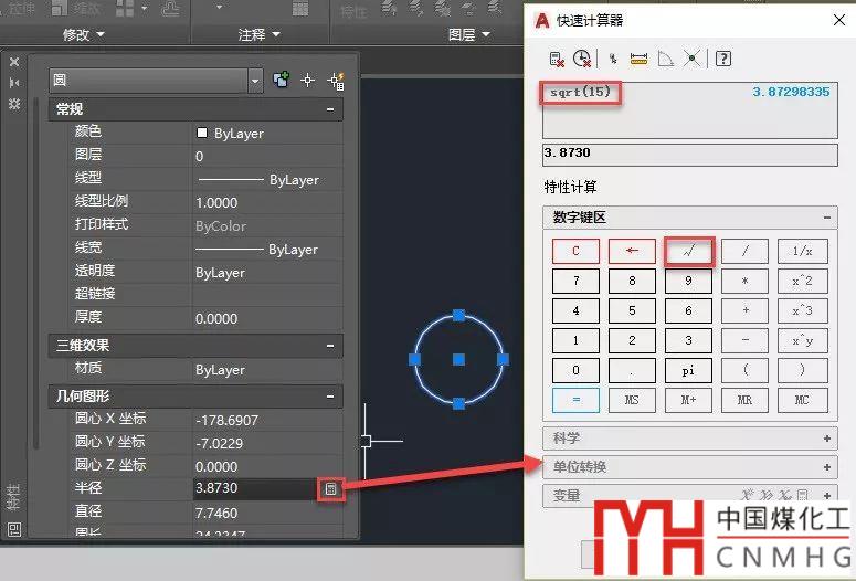 在特性面板中選中有些參數(shù)時(shí)后面會(huì)顯示一個(gè)計(jì)算器的按鈕,單擊此按鈕可以打開計(jì)算器,利用計(jì)算器輸入數(shù)值或算式來計(jì)算得到我們需要的數(shù)值。比如我們選擇一個(gè)圓,單擊半徑后面的計(jì)算器,我們可以設(shè)置圓的半徑等于根號(hào)15,如下圖所示。