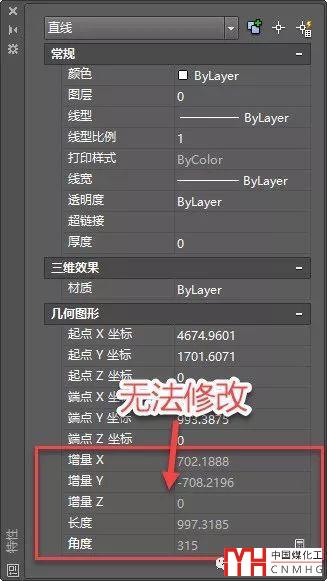 特性面板中顯示的參數(shù)有些是可以修改的,有些是不能修改的,比如選擇一條直線時(shí),會(huì)顯示直線的常規(guī)特性以及起點(diǎn)和端點(diǎn)坐標(biāo),還會(huì)顯示直線的各軸向的增量、長度和角度,起點(diǎn)和端點(diǎn)坐標(biāo)是可以修改的,但各軸向的增量、長度和角度是計(jì)算出來的結(jié)果,是無法修改的,如下圖所示。