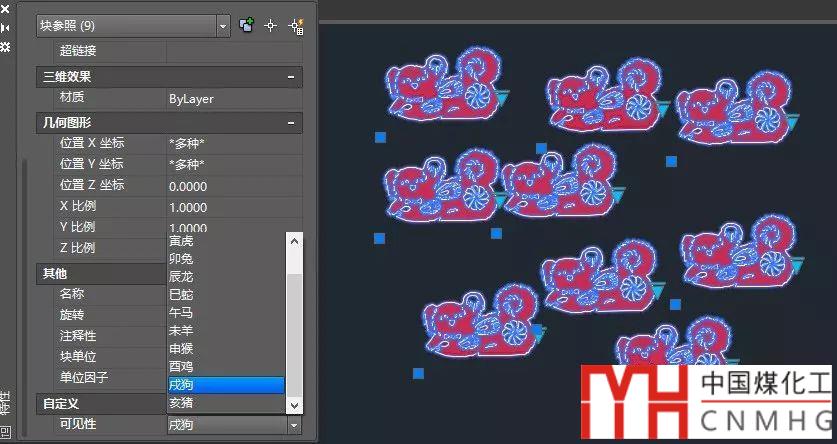 下圖中是我多年前無聊時(shí)做的一個(gè)十二生肖的動(dòng)態(tài)塊,同時(shí)選擇多個(gè)圖塊時(shí),在圖形窗口中也只能單獨(dú)修改某一個(gè)圖塊的可見性,如下圖所示。