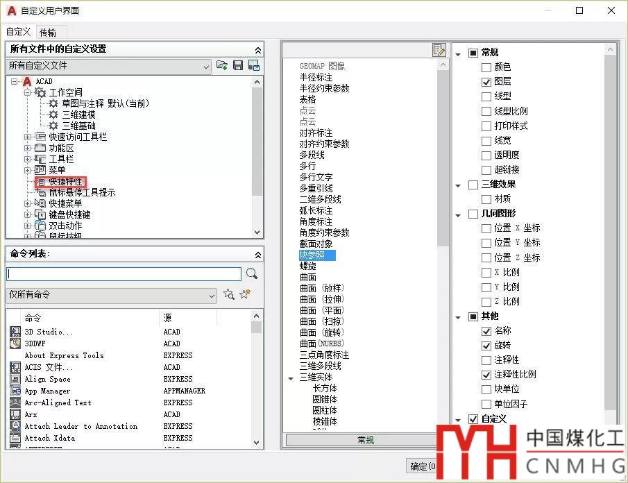 并且可以在CUI對(duì)話框中自己定制快捷特性顯示的內(nèi)容,如下圖所示。