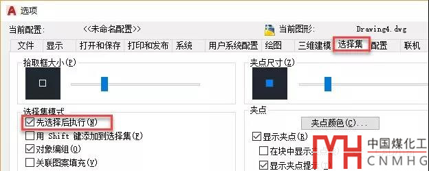 就是到選項(xiàng)OP對(duì)話框的“選擇集”選項(xiàng)卡中檢查“先選擇后執(zhí)行”選項(xiàng)是否被勾選了,如下圖所示。