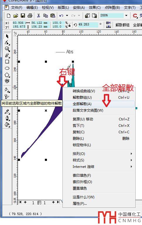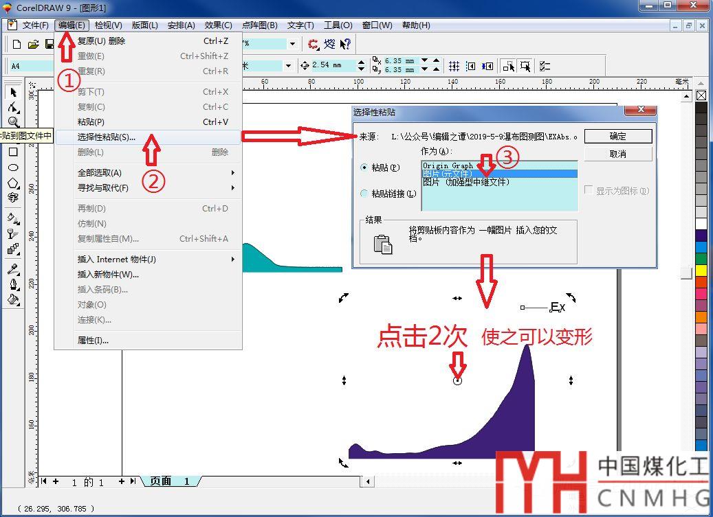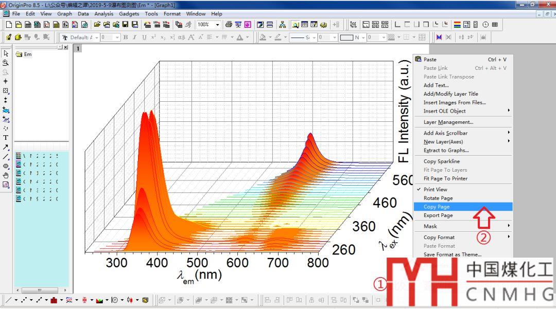首先,將上述Origin繪制的Ex和Abs曲線復(fù)制到CD中。具體步驟:在Ex或Abs曲線空白的白色邊緣(不要在曲線坐標(biāo)系內(nèi)部區(qū)域),點(diǎn)擊鼠標(biāo)右鍵,選擇“copy page”