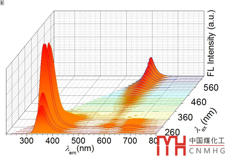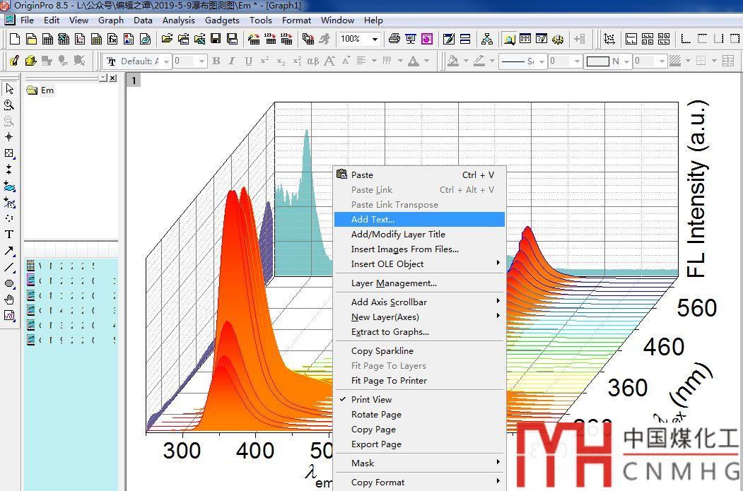 首先,在Origin中繪制一個(gè)發(fā)射光譜(Em)的Waterfall,這一系列發(fā)射光譜曲線是在不同激發(fā)波長(zhǎng)(220~580 nm)下測(cè)試的,因此,y軸是激發(fā)波長(zhǎng)(λex),x軸是發(fā)射波長(zhǎng),z軸是熒光強(qiáng)度。