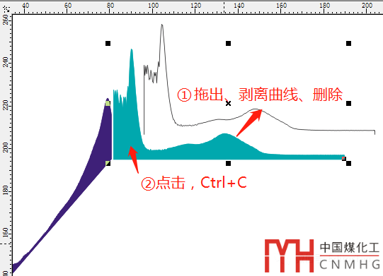 得到圖片如下圖所示,點(diǎn)擊曲線,拖出曲線并刪除(當(dāng)然,如果將這條曲線復(fù)制到Origin中,貼在側(cè)面坐標(biāo)系中,也是可以的,只不過是單條曲線,曲線下方無(wú)填充,大家也可以嘗試,具有不一樣的效果),然后選擇曲線的陰影,Ctrl+c復(fù)制一下。