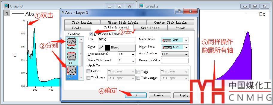 其次,在Origin中分別繪制激發(fā)光譜(Ex)和紫外-可見吸收光譜(Abs),分別按照下圖所示的步驟,隱藏所有數(shù)軸及標(biāo)題。設(shè)置曲線下方填充顏色(也可以設(shè)置半透明),關(guān)于設(shè)置填充顏色的教程在【編輯之譚】上一篇文章中有詳細(xì)介紹。詳細(xì)教程參見【Origin繪圖:XPS曲線半透明填充“疊影重重”】