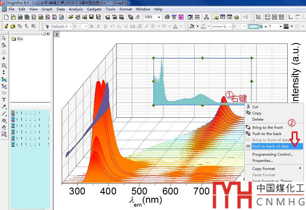 在前面繪制的waterfall圖的Origin中,Ctrl+v粘貼一下,得到下圖所示的效果。但是,粘貼的圖片遮擋了waterfall圖片,只要將這兩張圖片置于數(shù)據(jù)圖的底層,即“Push to back of data”。