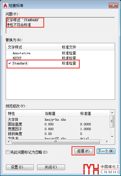 如果圖紙中使用了標(biāo)準(zhǔn)文件中沒有定義的格式或樣式,會顯示“名稱不符合標(biāo)準(zhǔn)”,則需要選擇一種替換樣式,再單擊“修復(fù)”按鈕,可以將樣式替換成標(biāo)準(zhǔn)文件中定義好的樣式,如下圖所示。