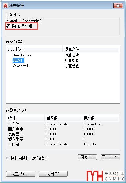 如果檢查發(fā)現(xiàn)同名但特性不符合標(biāo)準(zhǔn)的格式,比如文字樣式,就會顯示“特性不符合標(biāo)準(zhǔn)”,如下圖所示。