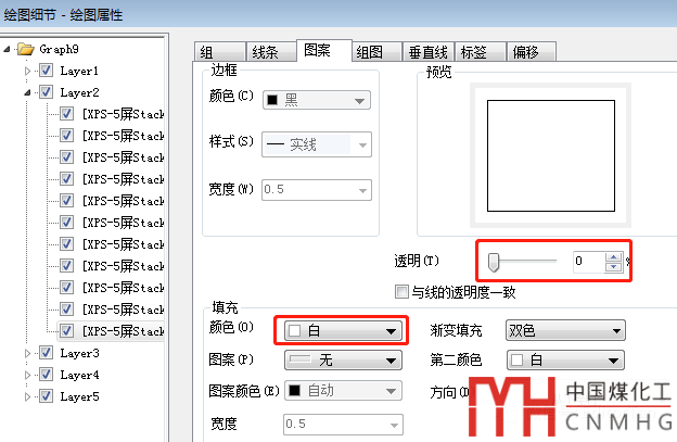 現(xiàn)在對(duì)每一堆XPS曲線進(jìn)行美化(線條顏色、線下填充半透明過渡色)。雙擊某一個(gè)圖層中的XPS曲線,在彈窗中點(diǎn)擊“線條”和“圖案”分別修改線條顏色和線下填充色。