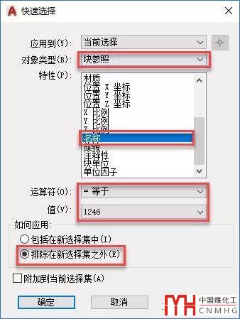 他的需求只是不想選某個名字的圖塊。圖塊比較多,而且比較分散,用常規(guī)的SHIFT反選的技巧不太方便,可以直接用快速選擇。在快速選擇用圖塊名設(shè)置為過濾條件,然后在底部勾選“排除在選擇集外”,就可以很容易達到他的目的,如下圖所示。