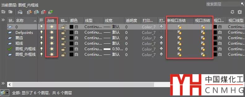 除此以外,凍結(jié)是與視口相關(guān)聯(lián)的。當(dāng)我們不進(jìn)入視口時(shí),圖層管理器中只有“凍結(jié)”一項(xiàng),相當(dāng)于所有視口凍結(jié),但如果在布局中進(jìn)入視口后,圖層管理器將增加“當(dāng)前視口凍結(jié)”和“新視口凍結(jié)”兩列,如下圖所示。
