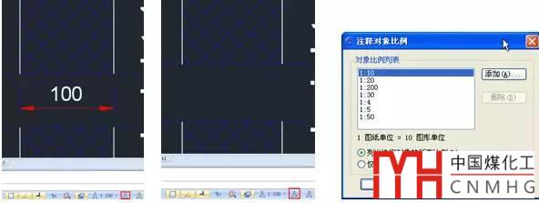 注釋可見性:顯示所有比例的注釋性對象。也就是說即使注釋對象比例跟當(dāng)前空間的注釋比例不一樣,也會(huì)被顯示。單擊此按鈕,按鈕切換為僅顯示當(dāng)前注釋比例的注釋對象,比如說當(dāng)前空間的注釋比例為1:100,如果某個(gè)注釋對象的比例列表中沒有1:100,那這個(gè)對象就不會(huì)被顯示,如下圖所示。