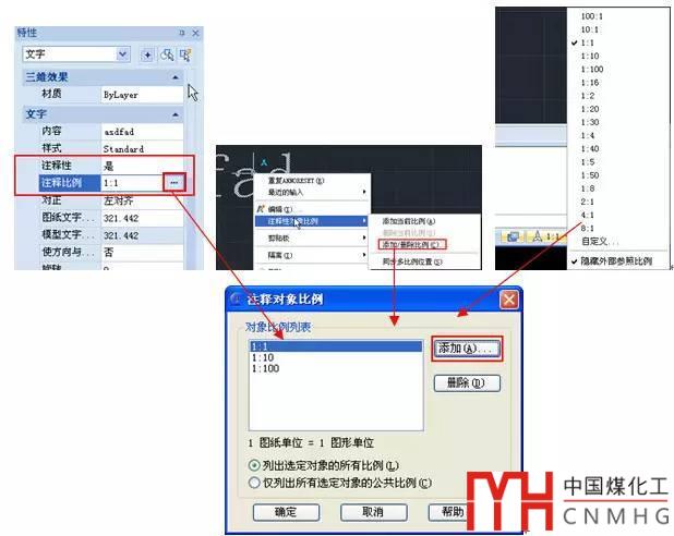 對象被設(shè)置為注釋性后,會(huì)多出一些參數(shù),例如注釋比例(objectscale)、文字會(huì)增加圖紙文字高度(設(shè)置打印時(shí)文字高度)和模型文字高度。對象的 注釋比例可以通過命令(objectscale)、屬性框(CTRL+1)、右鍵菜單來添加。如果圖中所有注釋性對象都采用相同的比例的話,直接在底部狀 態(tài)欄調(diào)整空間的注釋比例也可以將比例添加到對象的比例列表中,這種方式最簡單了。但如果希望有些注釋性對象在某種比例時(shí)不顯示或不改變大小,也可以不自動(dòng) 添加。