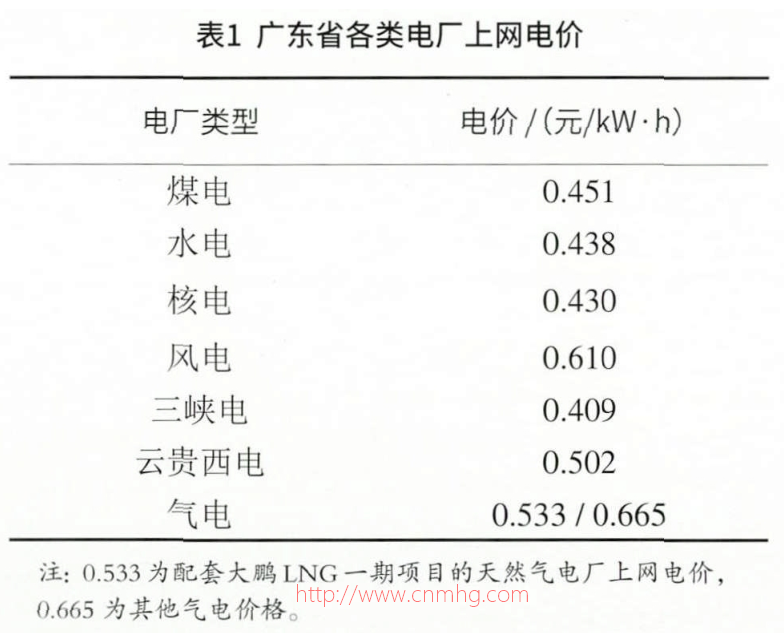 (5)從目前廣東省各類典型電廠上網(wǎng)電價來看,廣東省天然氣價格在全國處于較高水平,且相對比其他發(fā)電類型要高(如表1),天然氣燃料成本在發(fā)電成本中占比超過70%,燃料成本價格成為影響天然氣電廠經(jīng)營最重要因素。