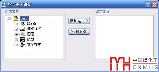 XBIND命令可以將外部參照中一些設置或塊定義綁定到當前圖中,在當前圖中添加依賴外部參照的命名對象,例如塊、文字樣式、標注樣式、圖層和線型。。對話框如下圖所示。