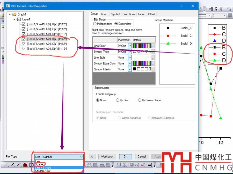 6.關(guān)鍵步驟?。。?/strong> 雙擊legend,打開plot properties面板,將g2組數(shù)據(jù)的圖形格式改為“scatter”
