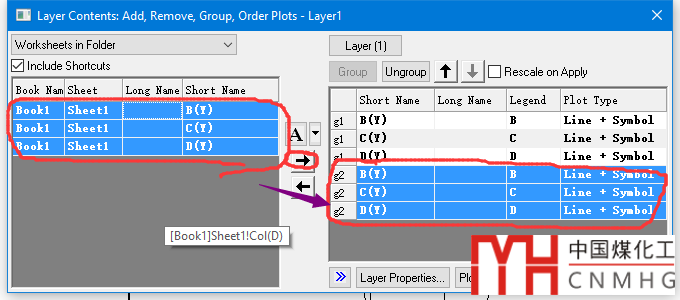 4. 選中左側(cè)的數(shù)據(jù),添加到右側(cè),會自動編組為g2,點擊OK返回圖形