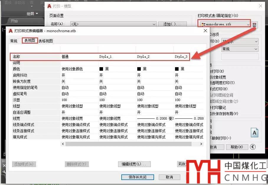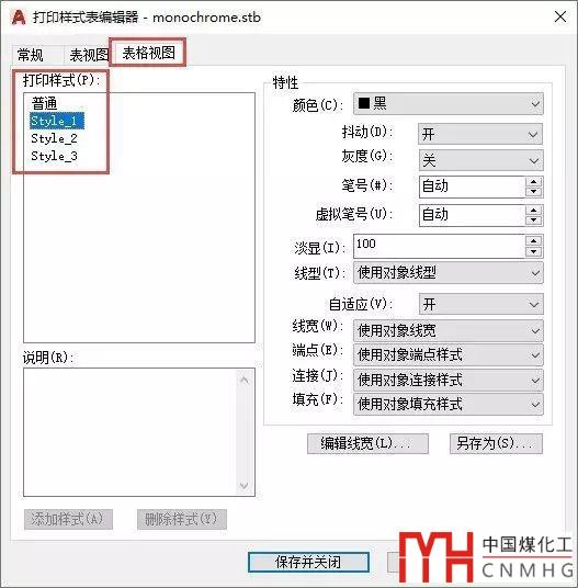 再次打開打印對話框,我們可以看到打印樣式列表中顯示的都是STB了,單擊編輯按鈕,打開打印樣式編輯器,默認會顯示“表視圖頁”,我們可以將對話框拉寬,可以看出STB中有幾個打印樣式,如圖所示。