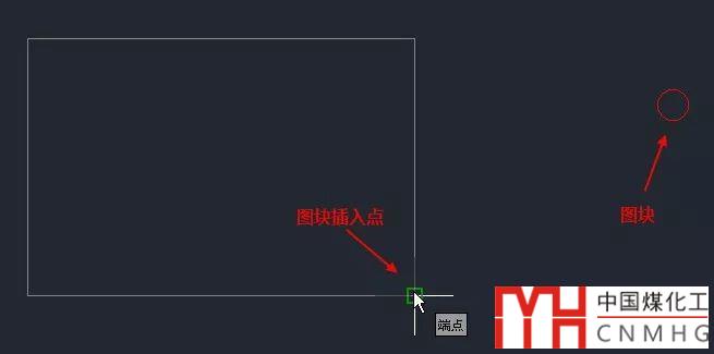 在創(chuàng)建圖塊的時(shí)候定義基點(diǎn)很重要,如果未定義基點(diǎn)或者定義了錯(cuò)誤的基點(diǎn),圖塊插入時(shí),圖塊的圖形離插入點(diǎn)很遠(yuǎn),會(huì)給圖塊插入帶來(lái)很多麻煩。如下圖所示,本來(lái)是想把圓形的圖塊的圓心定位到矩形的角點(diǎn)處,但由于基點(diǎn)定義錯(cuò)誤,當(dāng)插入圖塊捕捉矩形角點(diǎn)的時(shí)候,圓卻離得很遠(yuǎn)。
