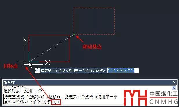 選擇所有圖形,執(zhí)行移動(dòng)M命令,移動(dòng)的基點(diǎn)選擇要作為圖塊基點(diǎn)的點(diǎn),目標(biāo)點(diǎn)選擇0,0點(diǎn),如下圖所示。