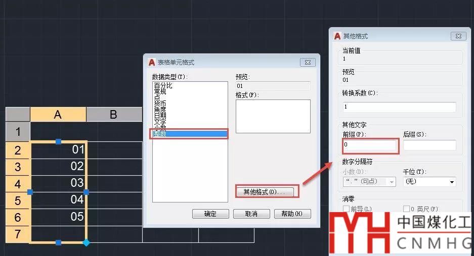 在CAD的表格也可以設(shè)置數(shù)據(jù)類型,但卻不像EXCEL一樣可以自定義數(shù)字格式,只能通過添加前綴的形式給數(shù)字前加0。我們可以復(fù)制結(jié)束后,再框選單元格,給這些單元格的數(shù)字前面添加0,操作方法如下: