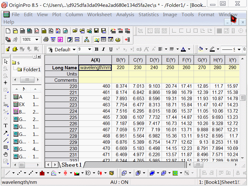 首先,繪制熒光光譜圖。全選熒光發(fā)射數(shù)據(jù)表,點擊下方工具欄的第5個按鈕(它左邊是柱狀圖或餅圖),在彈出菜單中選擇“Waterfall”工具,得到一個粗糙的無色彩的瀑布圖。似乎不好看,當(dāng)然除了顏色單調(diào)外,有個左下角區(qū)域的空白,這沒關(guān)系,這是因為在測試熒光發(fā)射光譜的時候,激發(fā)波長在增大,所以測試的發(fā)射光譜的起點也在紅移。我們將它在Y軸方向的鋪展(右下方的數(shù)軸)顛倒一下或許好看一點。另外Y軸(右下軸)刻度值是從590 nm遞減到220 nm的,這樣不符合常規(guī)也不符合測試順序。雙擊Y軸修改其范圍Scale從默認(rèn)的0.5~37.5顛倒一下,改為37.5~0.5,回車,即可將圖像顛倒過來。