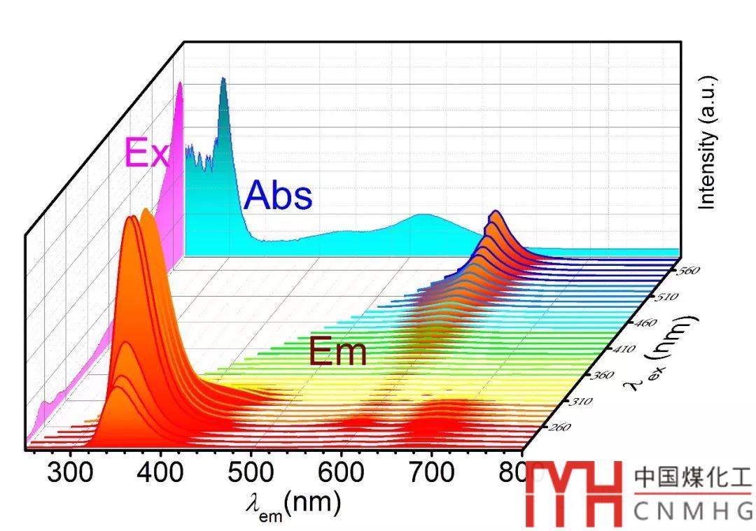 圖中需要準(zhǔn)備三種實驗類型的數(shù)據(jù):(1)紫外-可見吸收光譜數(shù)據(jù)(250~800 nm)(見圖中的Abs曲線);(2)激發(fā)光譜數(shù)據(jù)(見圖中的Ex曲線);(3)激發(fā)波長范圍在220~590 nm,每增加10 nm(其實可以將步長設(shè)置大一點,這樣可減少激發(fā)光譜的測試次數(shù))測試的熒光發(fā)射光譜數(shù)據(jù)(見圖中一些列Y軸平鋪的Em曲線)。