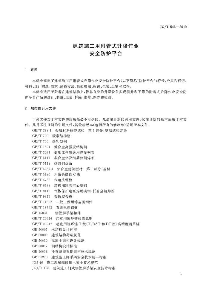 G20220307之GB∕T 546-2019 建筑施工用附著式升降作業(yè)安全防護(hù)平臺(tái)pdf