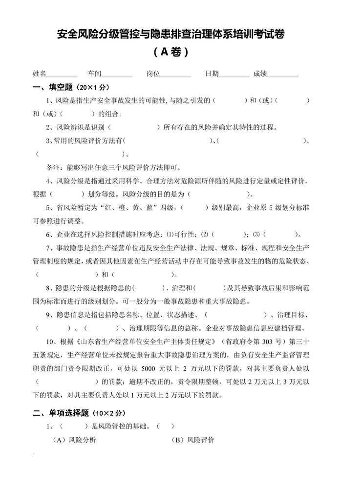 雙重預防體系培訓考試卷ABCD四套與答案doc