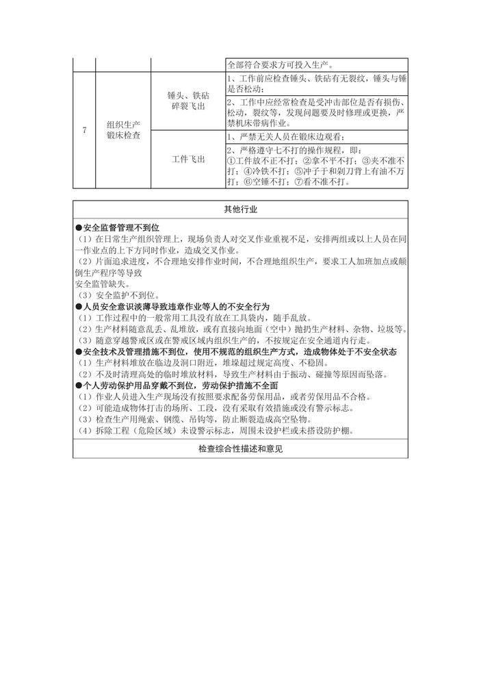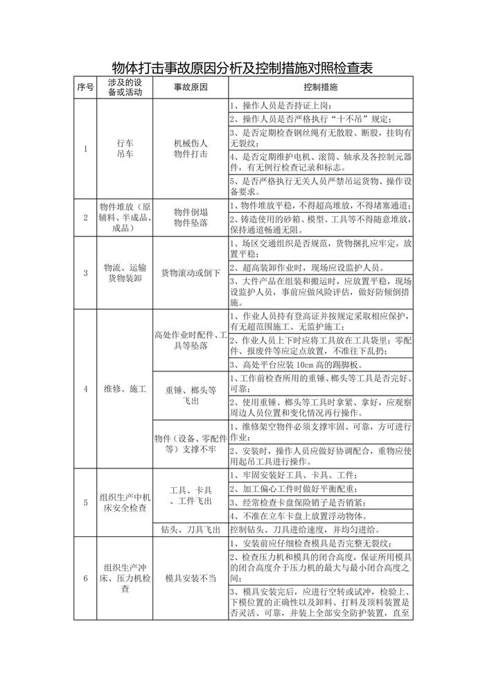 物體打擊事故原因分析及控制措施對照檢查表doc