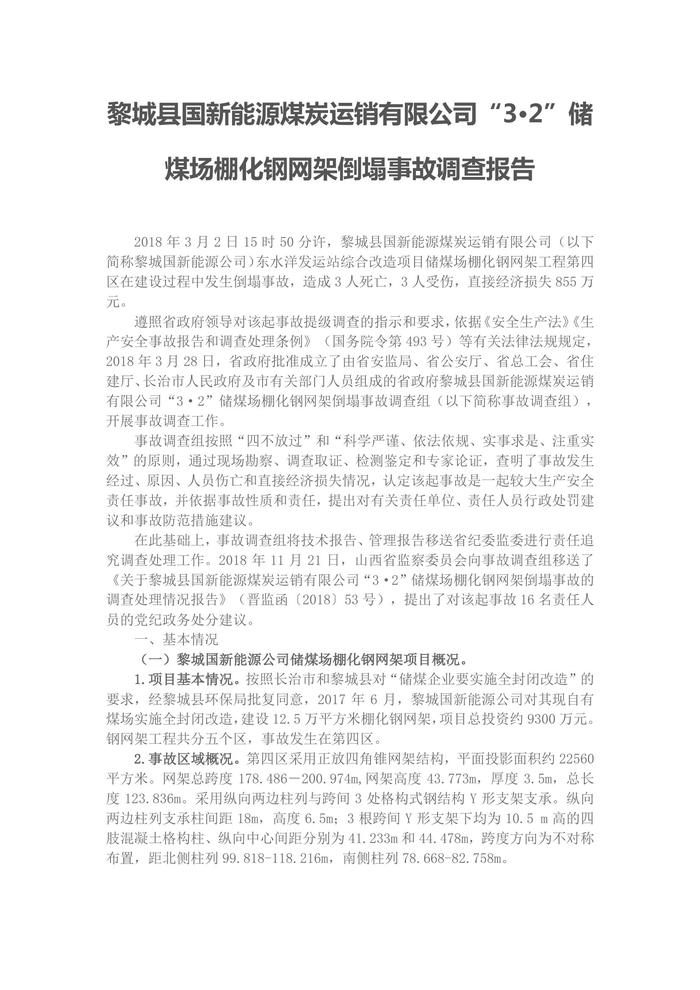 黎城縣國新能源煤炭運銷有限公司“3·2”儲煤場棚化鋼網(wǎng)架倒塌事故調(diào)查報告doc