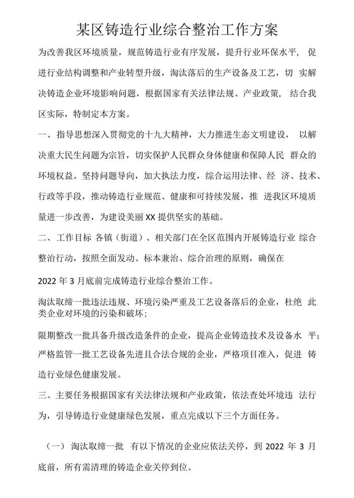 某區(qū)鑄造行業(yè)綜合整治工作方案docx