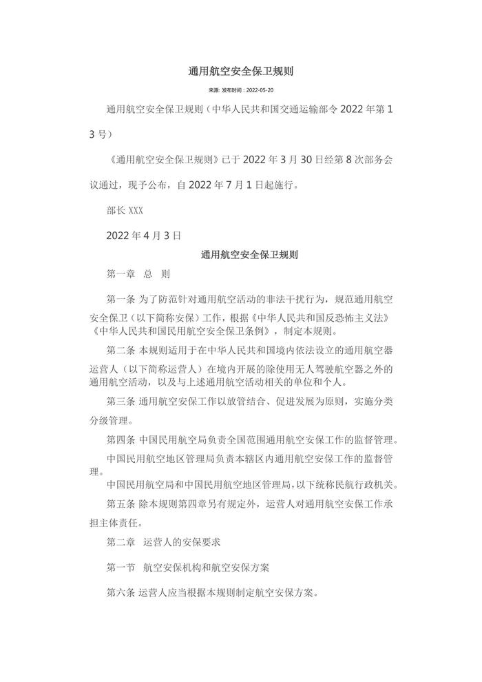 2022年7月施行《通用航空安全保衛(wèi)規(guī)則》docx