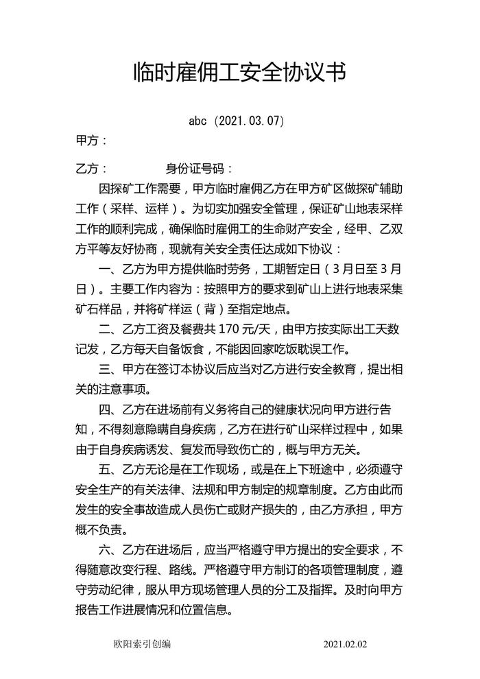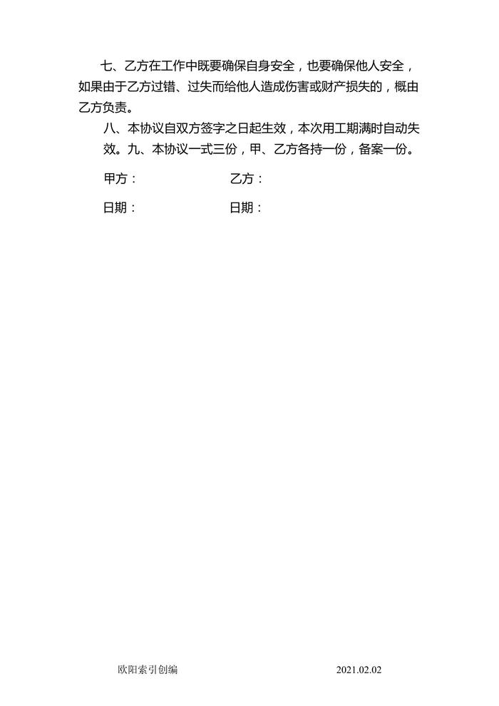 臨時雇傭工安全協(xié)議書doc
