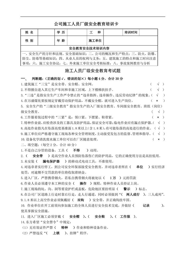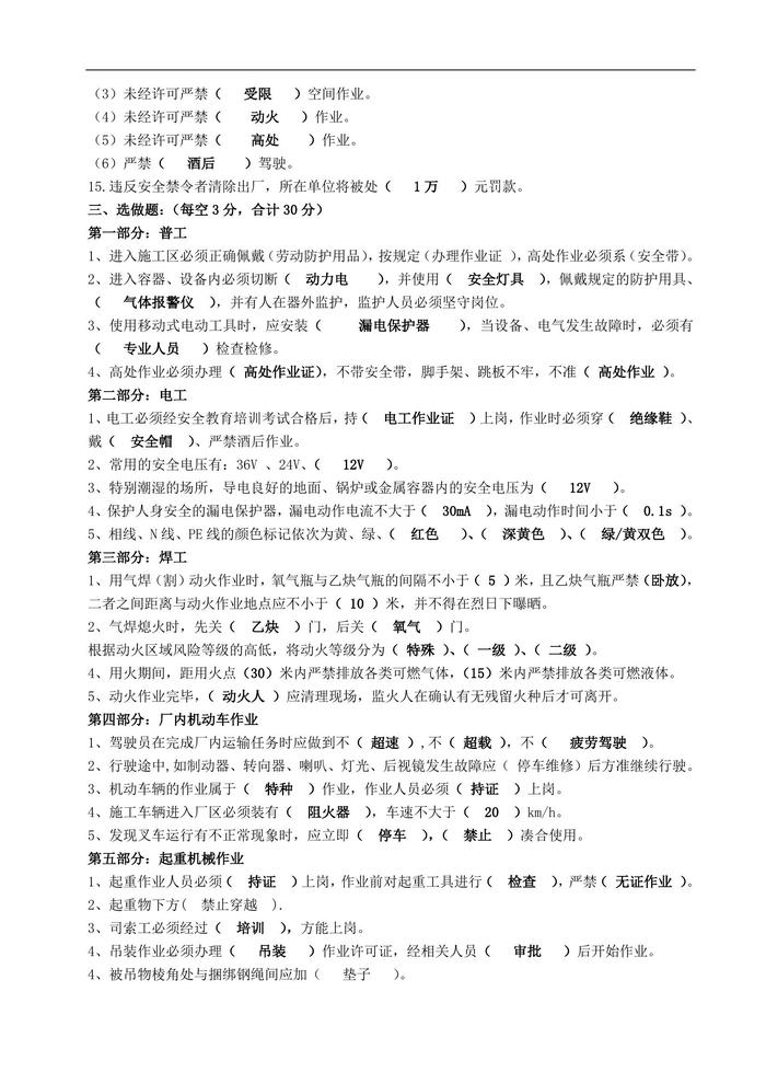 承包商外來人員施工人員廠級安全考試題附答案doc