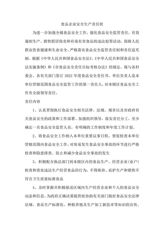 食品企業(yè)安全生產(chǎn)責任狀docx