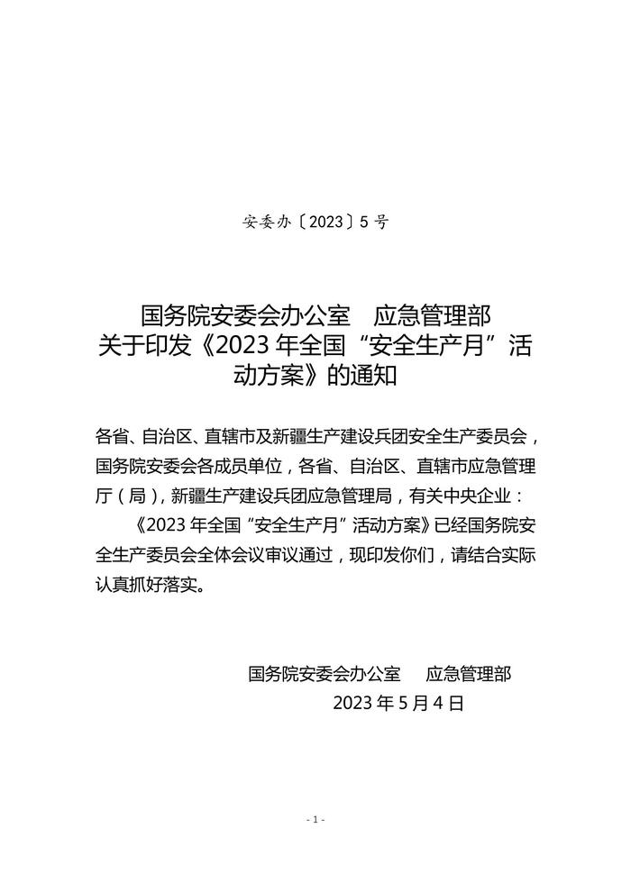 國務(wù)院、應(yīng)急管理部關(guān)于開展2023年安全月活動的通知docx 國務(wù)院、應(yīng)急管理部關(guān)于開展2023年安全月活動的通知docx