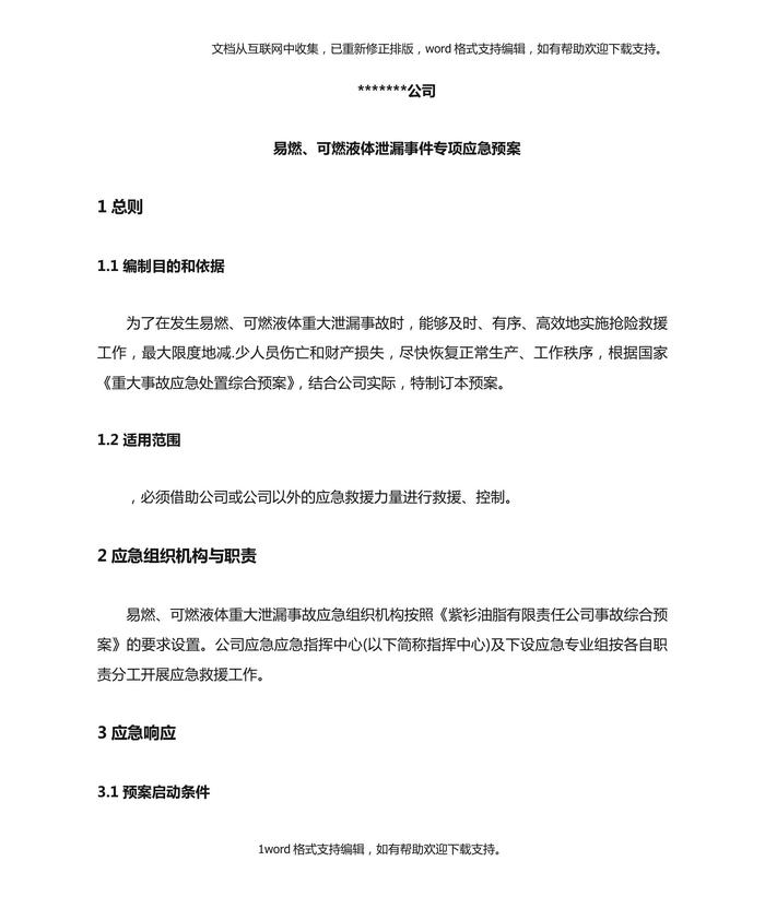 公司易燃、可燃液體泄漏事件專項(xiàng)應(yīng)急預(yù)案doc