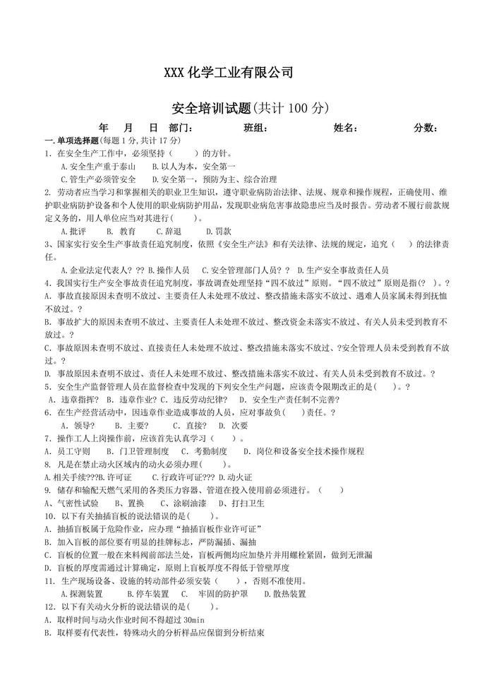 公司安全培訓(xùn)考試試題及答案docx