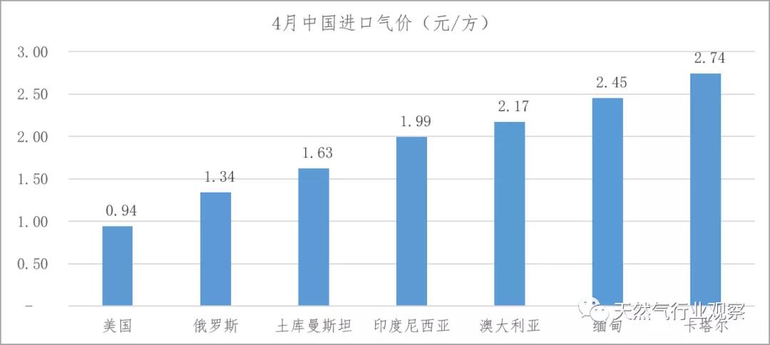 同期,中國(guó)從俄羅斯進(jìn)口液化天然氣,進(jìn)口平均價(jià)為1.32元/方,另外中俄東線4月份平均進(jìn)氣價(jià)為1.34元/方,均比美國(guó)價(jià)格高出42.6%。