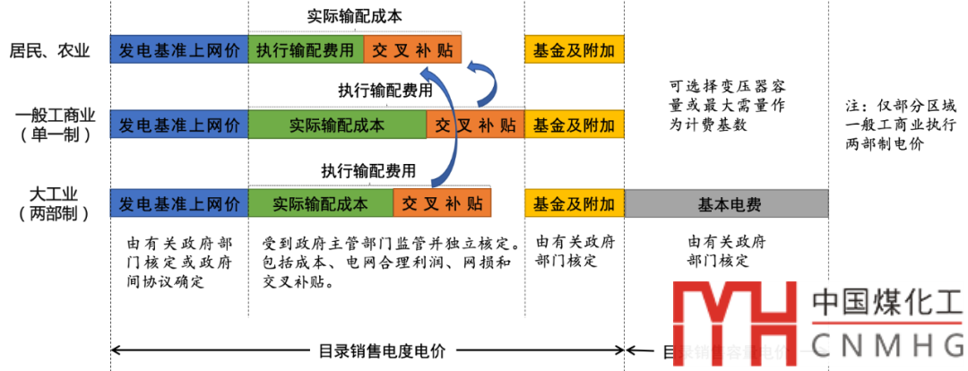 (三)市場化價格機制逐步理順。燃煤發(fā)電上網電價“基準價+上下浮動”的市場化價格機制啟動,跨省區(qū)特高壓線路輸電價格、區(qū)域電網輸電價格以及全國各省(區(qū)、市)輸配電價完成核定并進入第二周期核價。特別是,國家能源局2020年1月22日發(fā)布的《電力中長期交易基本規(guī)則(暫行)》(征求意見稿)中明確提出,市場化用戶用電價格包括電能量交易價格、輸配電價格、政府性基金及附加、輔助服務費用等,促進市場化用戶公平承擔系統(tǒng)責任。終端用電價格構成明確,如圖2、圖3所示。