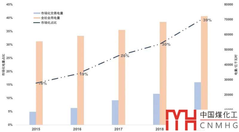(一)市場交易比重不斷擴大。自中發(fā)9號文發(fā)布至今,各省市有序放開發(fā)用電計劃,全國市場化交易電量快速攀升,比重不斷增加,如圖1所示。2019年全國電力市場交易電量已達約2.8萬億千瓦時,同比增長28%,占當年全社會用電量的39%。2019年6月27日《國家發(fā)展改革委關于全面放開經營性電力用戶發(fā)用電計劃的通知》(發(fā)改運行〔2019〕1105號)的發(fā)布,標志了市場化交易規(guī)模將會進一步擴大。