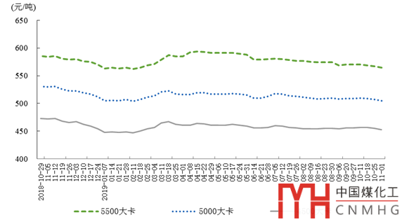 截至11月1日,秦皇島港5500大卡、5000大卡和4500大卡煤炭綜合交易價(jià)格分別為每噸565元、505元和453元,比9月底分別回落5元、4元和3元。